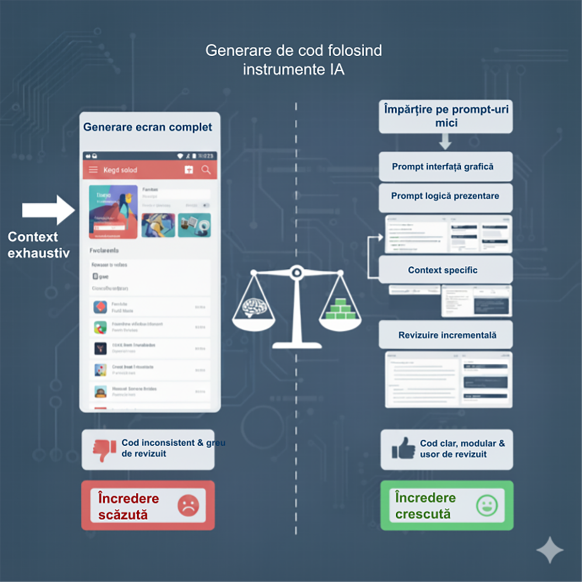 Context Engineering: Furnizarea unui fundal structurat (arhitectură, biblioteci, standarde de codare, fluxuri de lucru) astfel încât codul generat să se alinieze la nevoile specifice proiectului.