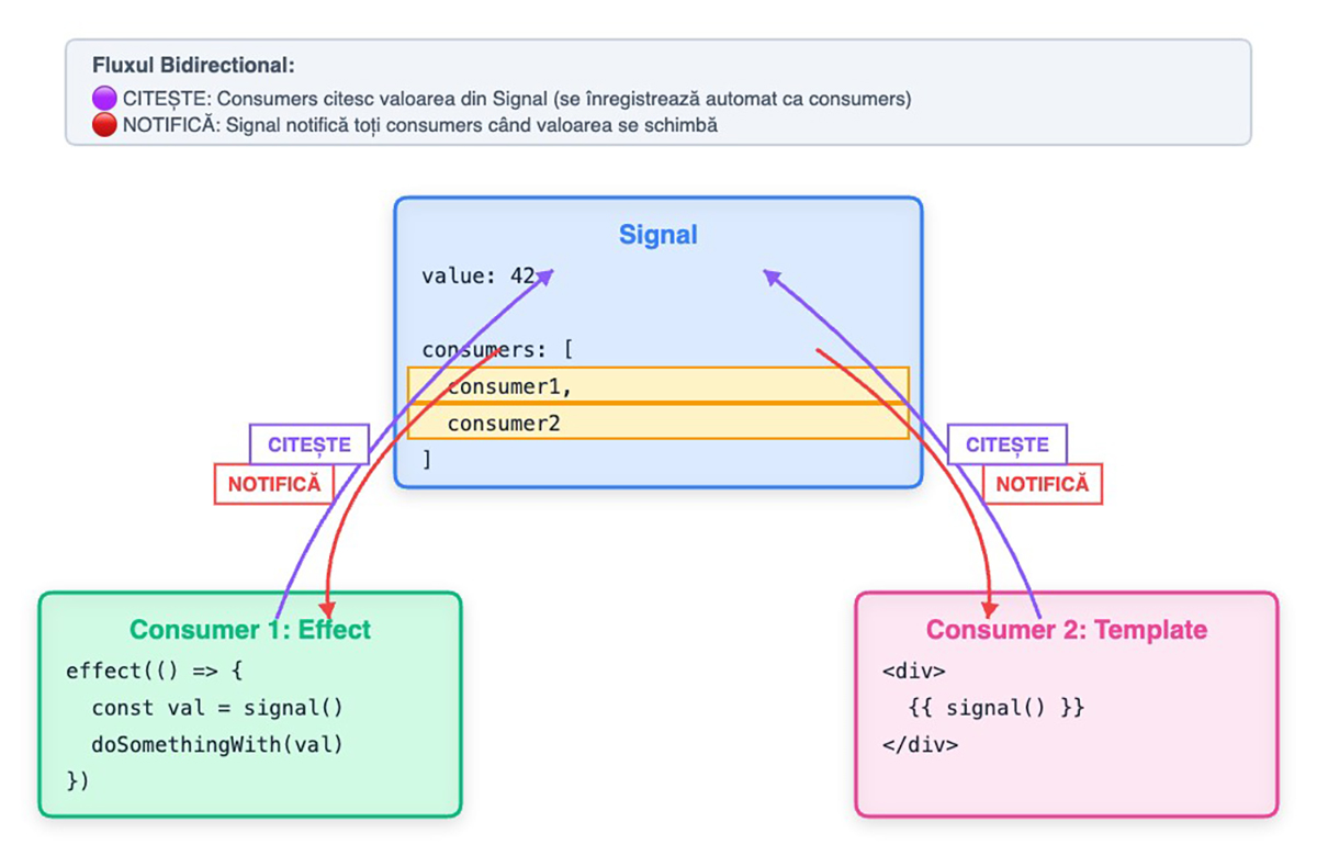 Ca să putem detalia puțin conceptul, am să mă refugiez în continuare în zona de Angular, mai explicit Angular Signals și să prezint câteva concepte introduse, care, deși sunt bazate pe modelul conceptual de mai sus, au dus lucrurile la un alt nivel.