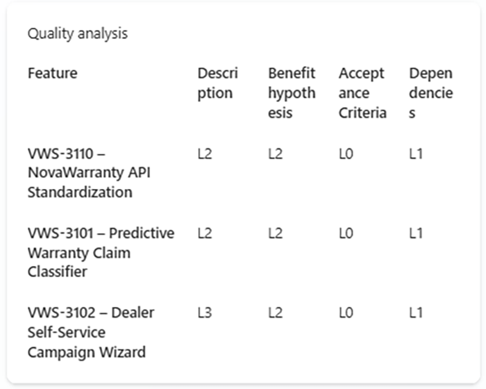 Un prim nivel al acestei analize este un readiness check. Majoritatea organizațiilor au reguli clare legate de ce câmpuri trebuie să fie completate pentru un feature sau un story, însă aceste reguli diferă semnificativ de la un client la altul. Faptul că un anumit câmp este obligatoriu pentru un feature aflat într-un anumit status într-o organizație nu înseamnă că aceeași regulă se aplică și în alta. Criteriile depind de context, de industrie și de modul în care organizația alege să își structureze procesul de livrare.
