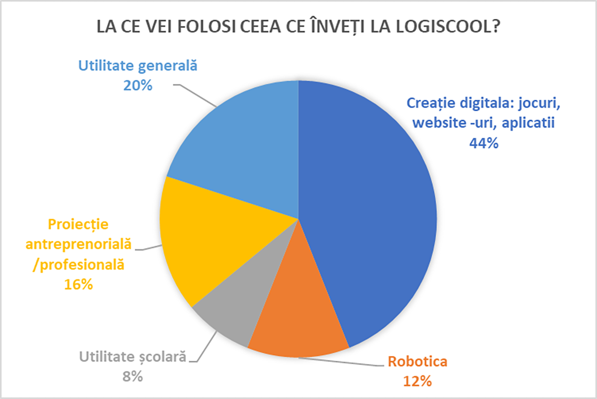 Am continuat cu întrebarea "La ce vei folosi ceea ce înveți la Logiscool ?" pentru a analiza utilitatea percepută de elevi referitor la temele învățate în școala de programare: tehnologii creative, noțiuni introductive în AI, robotică și programare. Răspunsurile primite indică o orientare predominant aplicativă a competențelor digitale în curs de dobândire de către elevii de primară și gimnaziu.