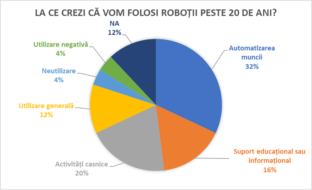 Predominant este segmentul care asociază utilizarea roboților pentru automatizarea muncii (32%) în special în domenii precum construcții, comerț, mecanică și activități manuale. Un segment important de 20% din respondenți proiectează utilizarea roboților pentru activități casnice de rutină: curățenie, gătit, organizare.
