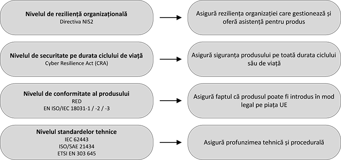 La bază, standardele tehnice de securitate cibernetică, precum IEC 62443 [7], ISO/SAE 21434 [9] și ETSI EN 303 645 [9], oferă practici inginerești concrete și concepte de securitate. Aceste standarde descriu modul în care securitatea cibernetică poate fi implementată la nivel de sistem, software și organizațional, dar ele nu acordă, prin ele însele, acces pe piață și nici nu definesc obligații legale.