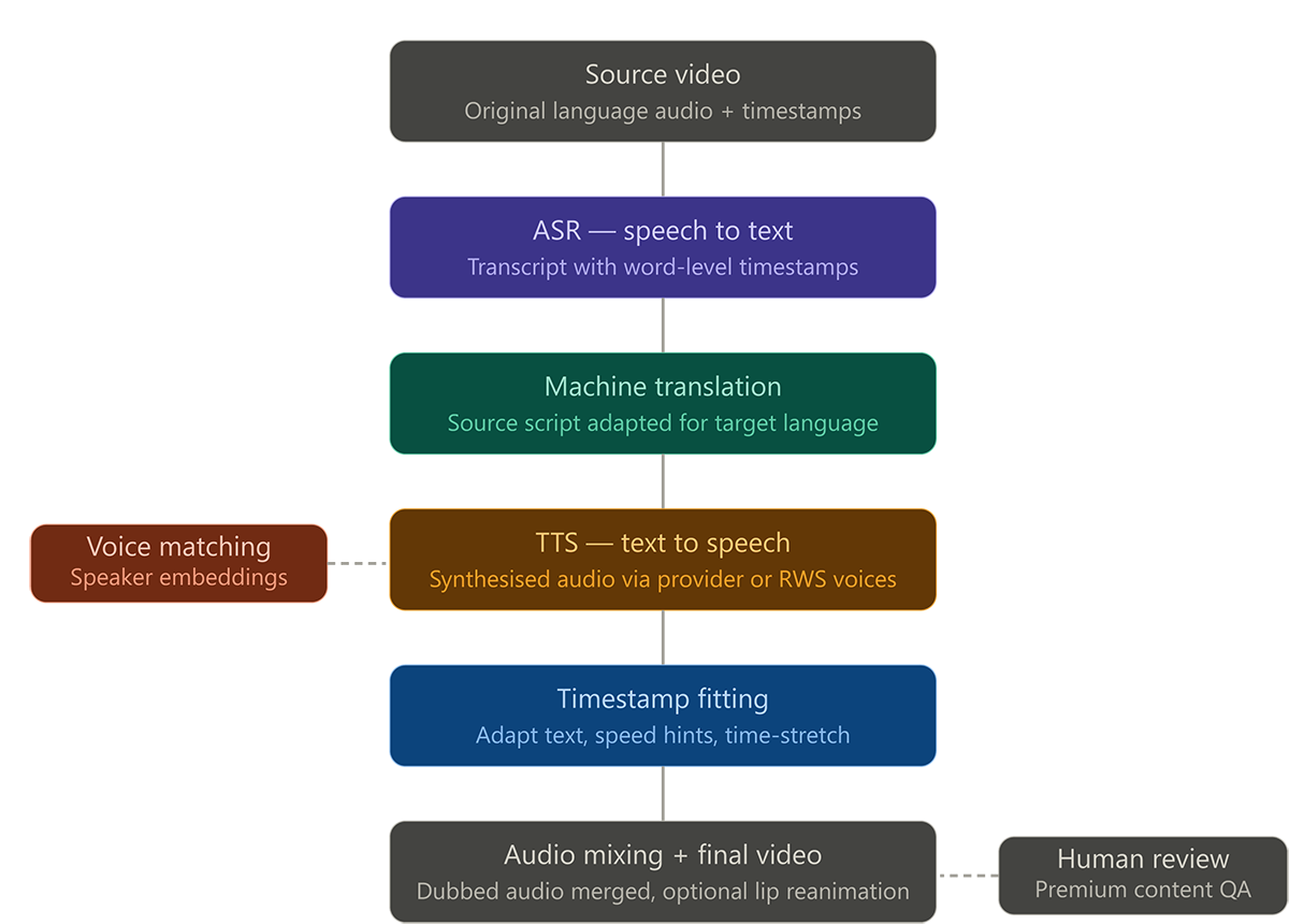 Imaginați-vă că urmăriți un documentar înregistrat inițial în coreeană și dublat perfect în limba engleză, dar nu de o echipă de actori de voce care au petrecut săptămâni întregi într-un studio, ci de un pipeline AI care a finalizat totul în doar câteva ore. Aceasta nu este o promisiune dintr-un viitor îndepărtat; ea prinde contur chiar acum, iar ingineria din spatele acestui proces este mai complexă și mai fascinantă decât ar părea la prima vedere. În iunie 2025, RWS a achiziționat drepturile de proprietate intelectuală ale Papercup, un start-up londonez specializat în dublare AI, integrând tehnologia de voce sintetică bazată pe emoții în platformele Language Weaver și Trados. Rezultatul este o soluție hibridă de dublare, concepută să funcționeze la nivel enterprise, în care intervenția umană rămâne parte din proces. La RWS, lucrăm tocmai la această problemă: construim și îmbunătățim încontinuu acele sisteme care fac dublarea bazată pe AI posibilă la scară largă.