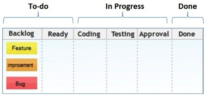 Structura de bază a unui Kanban board se rezumă la trei stări (coloane): To-Do, Ongoing (sau In Progress ), Done. Se pot însă defini stări specifice nevoilor de proiect, un exemplu clasic de Kanban board pentru software development se poate urmări în figura ataşată.