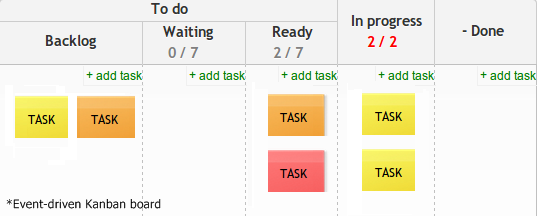Event-driven Kanban Board : util atunci când e nevoie şi de o intervenţie externă (ex: aprobare) pentru a continua cu executarea task -urilor în proces.