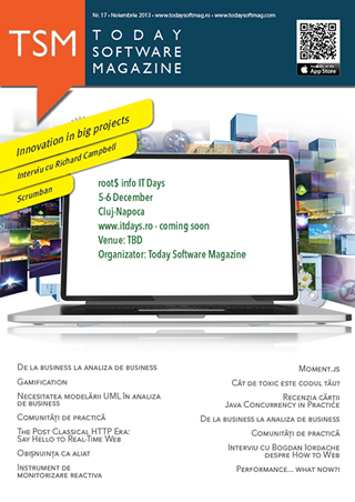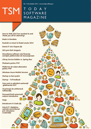 Lansarea numărului 43 al Today Software Magazine. Ianuarie 27 (Cluj) - Ora 18:00 Siemens Cluj Office strada Gării, nr 21, Cluj-Napoca. Today Software Magazine, comunitate construită în jurul revistei TSM. Data înfiinţării: 06.02.2012 Nr. membri: 2977