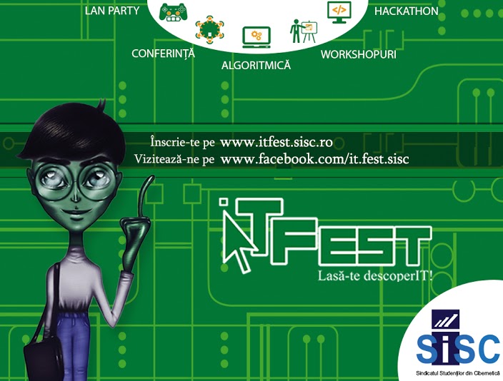 Sindicatul Studenților din Facultatea de Cibernetică, Statistică și Informatică Economică (SiSC) anunță începerea celei de-a VIII-a ediții a proiectului național ITFest, eveniment devenit deja o tradiție. Festivalul va avea loc în perioada 18 octombrie - 8 noiembrie 2015, în București. SiSC este cea mai veche organizație studențească din ASE, înființată în anul 1996, ce are peste 150 de proiecte desfășurate cu succes de la înființare și până în prezent. Principalul scop al organizației este acela de a reprezenta studenții, atât în raport cu mediul academic, dar și prin crearea de oportunități de dezvoltare personală și profesională.