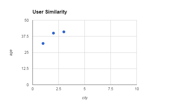 Pe baza graficului putem observa faptul că cele două puncte din partea superioară sunt mai apropiate (mai ales dacă atribuim greutăți caracteristicilor importante). Acestă apropiere a punctelor indică asemănarea utilizatorilor (utilizatorii cu id-ul 2 și 3). În acest caz, această asemănare este dată de valorile apropiate ale vârstei.