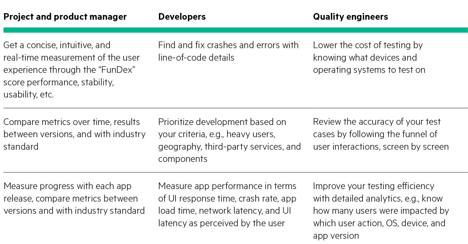 On their own, mobile testing and analytics are valuable, but have their limitations. Testing alone only collects a small sample of data and is unlikely to represent how the larger population perceives an app, while analytic alone does not provide the full picture. However, they bring significant value when they are combined. Read further to understand how HPE Mobile app solution helps you measure the various attributes of the user experience—whether in our testing lab or in the wild—throughout the app lifecycle, and improve those that fail to meet expectations.