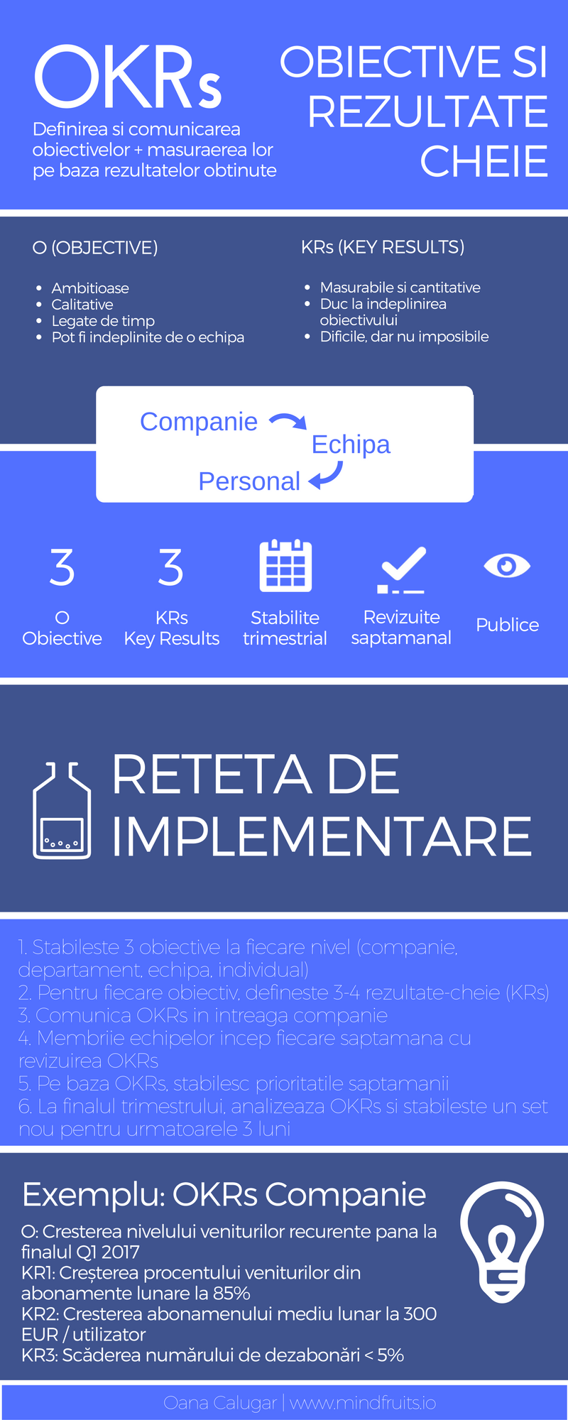 Provocare: Gândește-te la OKRs pentru echipa ta pentru Q1 2017, dar concentrează-te pe un singur set de Obiective și Rezultate-cheie. Dacă te găsești în fața a 3-4 seturi, taie-le pe cele mai puțin importante. Este un prim pas valoros pentru o echipă de produs performantă, prin organizarea și îndeplinirea obiectivelor!