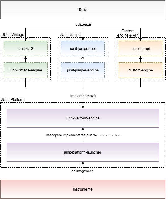 Diagrama precedentă poate fi sumarizată ca JUnit 5 = JUnit Platform + JUnit Jupiter + JUnit Vintage. Trebuie menționat faptul că platforma oferă utilizatorului flexibilitatea de a folosi propriul motor de testare prin simpla implementare a interfețelor din artefactul junit-platform-engine și înregistrarea acestuia. Compatibilitatea cu versiunile anterioare (a 3-a și a 4-a) este realizată prin motorul JUnit Vintage, iar avantajul este că acesta poate exista în proiect simultan cu JUnit Juniper.
