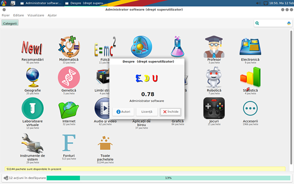 EDU este structurat pe 24 de secțiuni, cu peste 55.000 de pachete. Facem precizarea că pentru instalarea unui program este nevoie de unul sau de mai multe pachete, în funcție de dependenţe. (Pentru a funcţiona corect, un program are nevoie de una sau mai multe componente externe numite generic pachete). Noutatea în această distribuție este acest utilitar cu interfaţă grafică specifică şi originalitatea programelor incluse, dintre care amintim laboratoare virtuale, microscopul electronic, simulatoare şi multe alte programe utile.