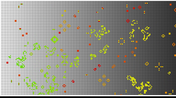 Soluția noastră va reprezenta un algoritm scris de un programator, iar cea finală este interesantă așa cum se poate remarca în screenshot. Pentru a face lucrurile mai provocatoare, am folosit pentru fiecare celulă o vârstă. Acestea pot trăi maxim 310 ani, culoarea lor evoluând de la verde spre roșu / negru.