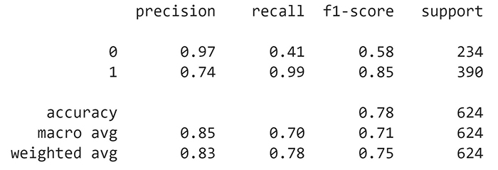 Cu o perioadă de "învăţare" de mai puțin de 10 minute, putem observa rezultatele de mai jos care, așa cum am menționat mai devreme, par să fie o realizare a obiectivului nostru declarat de a avea un model cu un "recall" ridicat în ceea ce privește pneumonia.