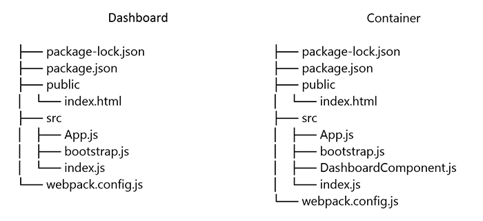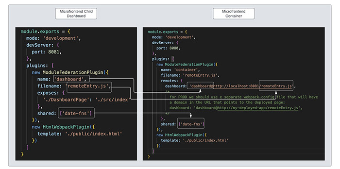 Configurarea și utilizarea Module Federationului este destul de simplă. Dar, pe măsura ce aplicația crește, la fel va crește și complexitatea, iar pentru un start de bază este destul să avem următoarele elemente:
