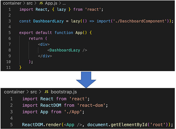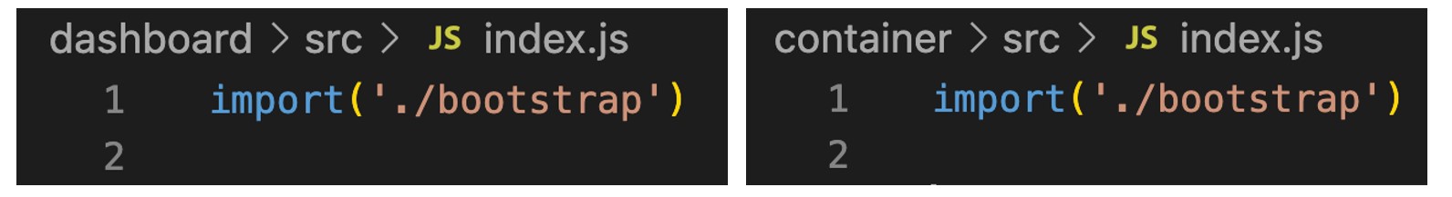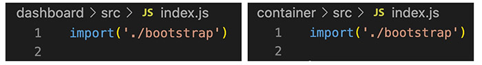 Un lucru important de reținut este că folosim un mod dinamic de a consuma micro frontendurile. Prin urmare, chiar dacă folosim componente din același repository (monorepo), trebuie să încărcăm în mod asycron aceste componente, deoarece ele vor fi interpretate ca module externe. De aceea, trebuie să avem un fișier de 'pornire' (bootsratp.js) unde să copiem conținutul fișierului 'index.js' și apoi să importăm 'bootstrap.js' în 'index.js'.
