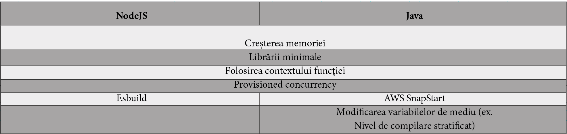 În funcție de limbajul de scriere și compilatorul folosit pentru funcții influențează direct posibilitățile de îmbunătățire. Vom discuta în acest articol funcții lambda din AWS, scrise în NodeJS și Java. Există metode specifice cât și comune de eficientizare a execuției, precum creșterea memoriei alocate, utilizarea unui număr redus de librarii și dependințe, cât și folosirea contextului funcției lambda pentru stocarea variabilelor de inițializare.