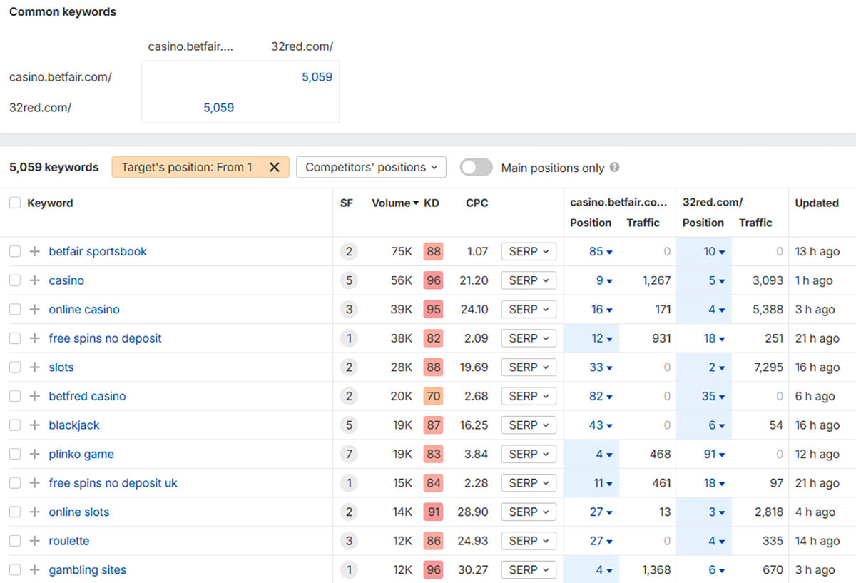 Extras din Ahrefs - Content Gap Analysis - pentru identificarea intersecției de conținut între Betfair Casino și competitorul principal din UK: 32Red